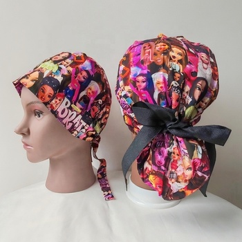 Brat Scrub Caps com Forro De Cetim Design Personalizado Bonito Dos Desenhos Animados Imprimir Tampas De Enfermeira Cetim-Forrado Personagem Impresso Rabo De Cavalo Scrub Chapéus